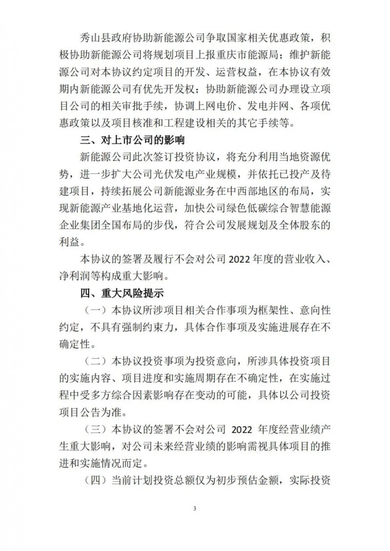 此次簽訂投資協(xié)議,新能源公司將充分利用當?shù)刭Y源優(yōu)勢,進一步擴大公司光伏發(fā)電產(chǎn)業(yè)規(guī)模,并依托已投產(chǎn)及待建項目,持續(xù)拓展公司新能源業(yè)務(wù)在中西部地區(qū)的布局,實現(xiàn)新能源產(chǎn)業(yè)基地化運營,加快公司綠色低碳綜合智慧能源企業(yè)集團全國布局的步伐。