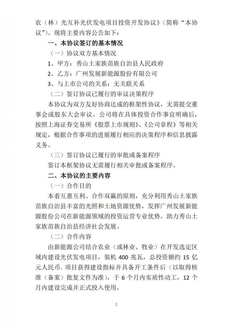 2月26日,廣州發(fā)展發(fā)布公告稱,其全資子公司廣州發(fā)展新能源股份有限公司與與重慶市秀山土家族苗族自治縣人民政府簽署《秀山土家族苗族自治縣400MW農(nóng)(林)光互補光伏發(fā)電項目投資開發(fā)協(xié)議》。