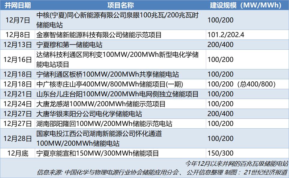 21世紀(jì)經(jīng)濟(jì)報(bào)道記者根據(jù)公開(kāi)信息不完全統(tǒng)計(jì)發(fā)現(xiàn),截至12月28日,本月已有28個(gè)新型儲(chǔ)能項(xiàng)目完成并網(wǎng)交付。這其中,不乏數(shù)十個(gè)百兆瓦級(jí)容量的大型地面電站、獨(dú)立共享儲(chǔ)能電站順利并網(wǎng),也誕生了多個(gè)地方儲(chǔ)能電站的規(guī)模之最、建設(shè)速度之最。事實(shí)上,這也為明年國(guó)內(nèi)大型儲(chǔ)能電站的推進(jìn)立下了樂(lè)觀的預(yù)期。
