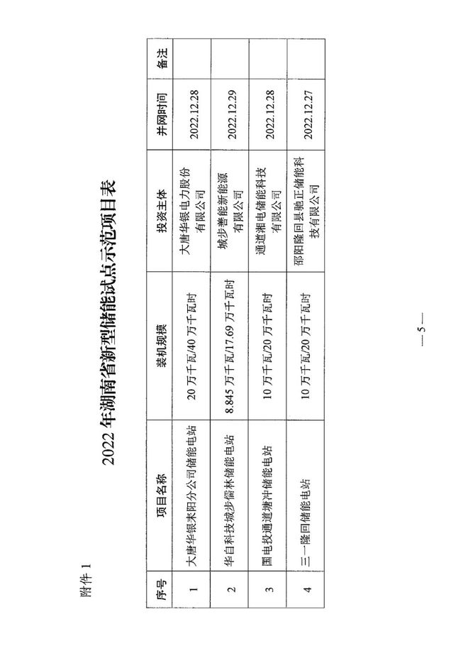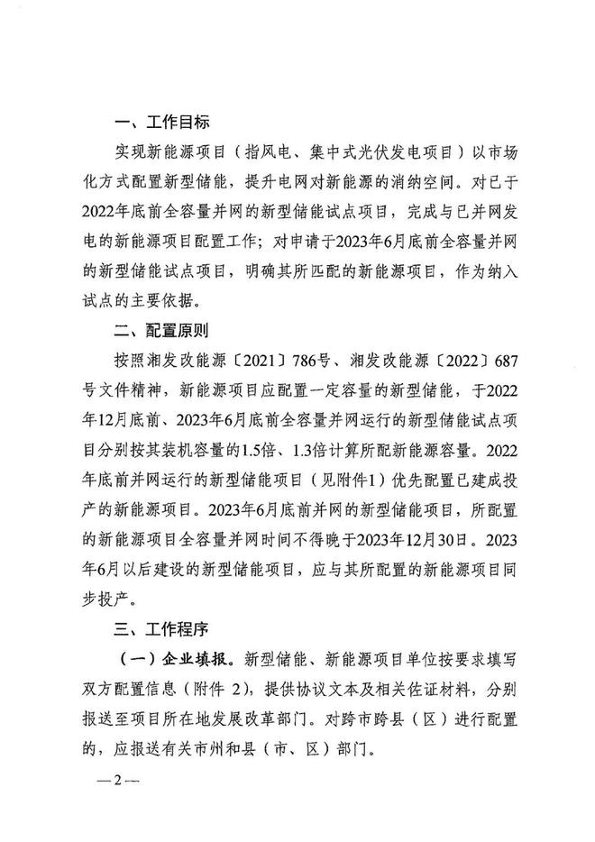 按照湖南發(fā)改委相關(guān)文件,新能源項目應(yīng)配置一定容量的新型儲能,于2022年12月底前,2023年6月底前全容量并網(wǎng)運行的新型儲能試點項目分別按其裝機容量的1.5倍、1.3倍計算所配新能源容量。