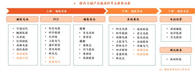 大儲產業(yè)鏈主要包括上游儲能設備、中游系統(tǒng)集成、下游電站等環(huán)節(jié)。儲能電池和PCS是大儲產業(yè)鏈價值量最大的兩個環(huán)節(jié),陳驍?shù)热苏J為,儲能電池絕對龍頭寧德時代,第二梯隊比亞迪、鵬輝能源、億緯鋰能、國軒高科、南都電源、海辰儲能等有望借國內大儲市場加速贏得動力電池之外的第二成長曲線。國內大儲PCS頭部企業(yè)陽光電源、科華數(shù)據(jù)、上能電氣、盛弘股份、國電南瑞、新風光等在裝機提速+毛利改善下業(yè)績有望受益。