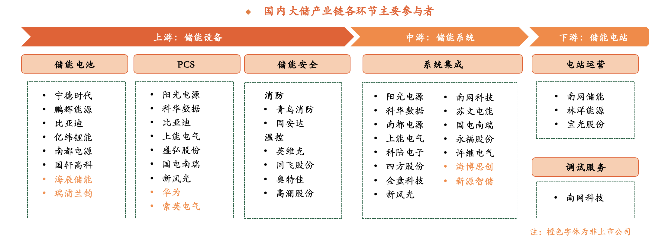 大儲(chǔ)產(chǎn)業(yè)鏈主要包括上游儲(chǔ)能設(shè)備、中游系統(tǒng)集成、下游電站等環(huán)節(jié)。儲(chǔ)能電池和PCS是大儲(chǔ)產(chǎn)業(yè)鏈價(jià)值量最大的兩個(gè)環(huán)節(jié),陳驍?shù)热苏J(rèn)為,儲(chǔ)能電池絕對(duì)龍頭寧德時(shí)代,第二梯隊(duì)比亞迪、鵬輝能源、億緯鋰能、國軒高科、南都電源、海辰儲(chǔ)能等有望借國內(nèi)大儲(chǔ)市場(chǎng)加速贏得動(dòng)力電池之外的第二成長曲線。國內(nèi)大儲(chǔ)PCS頭部企業(yè)陽光電源、科華數(shù)據(jù)、上能電氣、盛弘股份、國電南瑞、新風(fēng)光等在裝機(jī)提速+毛利改善下業(yè)績有望受益。