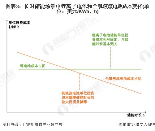 根據(jù)長時儲能委員會 ( LDES ) 與麥肯錫 2021 年底聯(lián)合發(fā)布的報告,由于配套的儲能時長較長,長時儲能在考慮投資成本時更加注重單位能量 ( 每 Wh ) 的投資成本而非單位功率 ( 每 W ) 的投資成本。隨著儲能時長的增加,全釩液流電池系統(tǒng)的單位成本將得到明顯攤薄 ( 功率單元成本不變,僅需增加能量單元 ) ,而鋰電池系統(tǒng)的單位成本則基本固定。因此,從成本角度,釩液流電池在長時儲能的場景中較當(dāng)前主流的鋰離子電池具備一定的比較優(yōu)勢。
