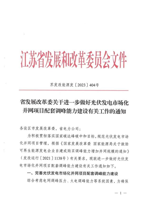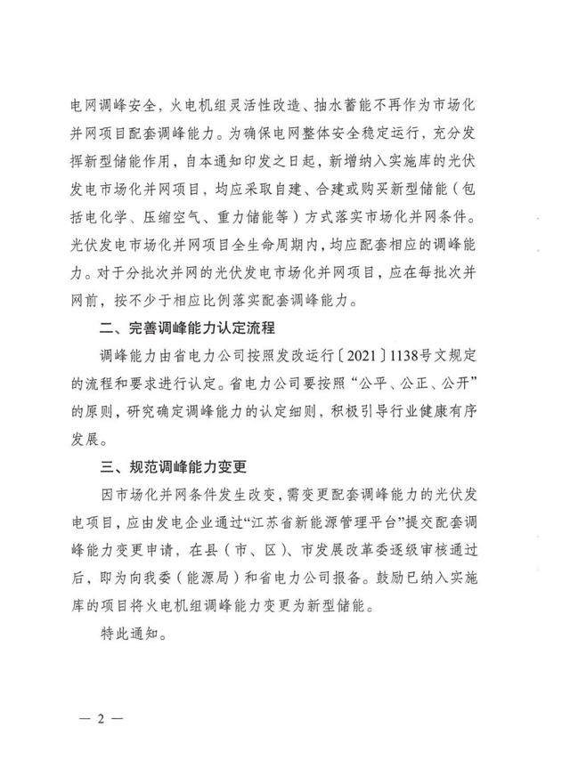 4月17日,江蘇省發(fā)展改革委發(fā)布《關(guān)于進(jìn)一步做好光伏發(fā)電市場化并網(wǎng)項(xiàng)目配套調(diào)峰能力建設(shè)有關(guān)工作的通知》(文件原文附后),文件提出: