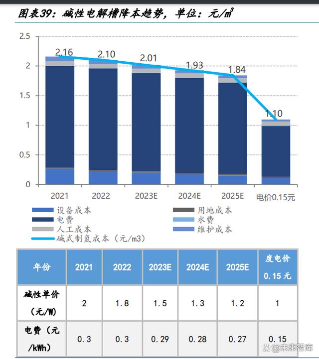 測算邏輯與假設:以 1MW 級的堿性電解槽與 1MW 級的 PEM 電解槽為例進行成本平 衡點的測算,堿性電解槽效率為 PEM 電解槽的 90%,功率范圍窄造成的效率損失 約為 10%,兩種電解槽均運行 15 年產(chǎn)氫約 900 萬方。隨著 PEM 電解槽成本持續(xù) 的下降,在電價相同的情況下,預計PEM的設備成本為堿性設備成本的3-4倍時, PEM 的單位制氫成本與堿性的單位制氫成本持平。