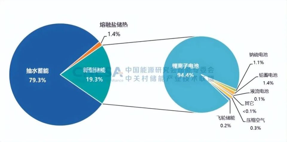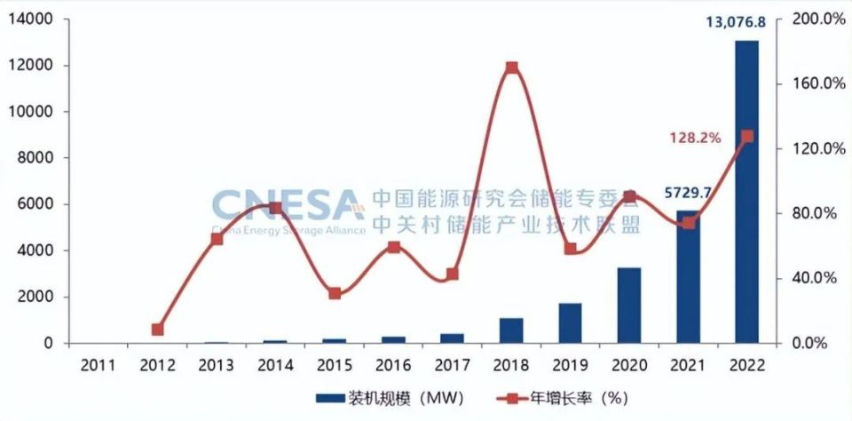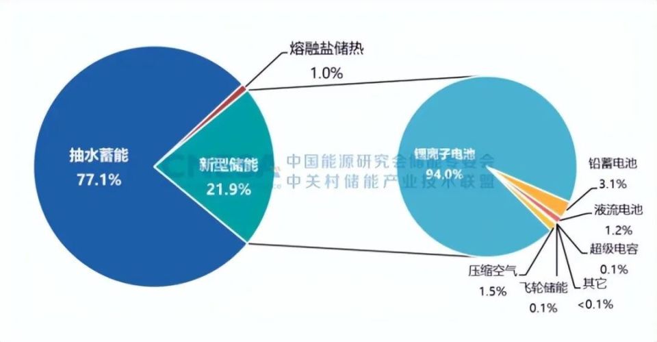 2022年,中國新增投運(yùn)電力儲(chǔ)能項(xiàng)目裝機(jī)規(guī)模首次突破15GW,達(dá)到16.5GW,其中,抽水蓄能新增規(guī)模9.1GW,同比增長75%;新型儲(chǔ)能新增規(guī)模創(chuàng)歷史新高,達(dá)到7.3GW/15.9GWh,功率規(guī)模同比增長200%,能量規(guī)模同比增長280%;新型儲(chǔ)能中,鋰離子電池占據(jù)絕對(duì)主導(dǎo)地位,比重達(dá)97%,此外,壓縮空氣儲(chǔ)能、液流電池、鈉離子電池、飛輪等其它技術(shù)路線的項(xiàng)目,在規(guī)模上有所突破,應(yīng)用模式逐漸增多。