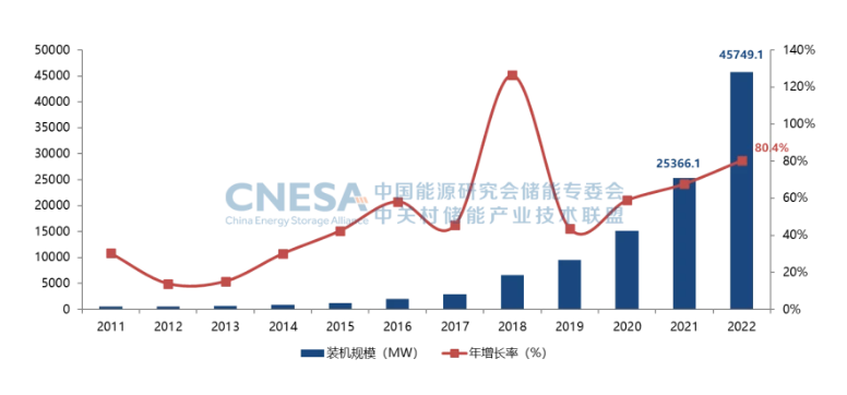 根據(jù)CNESA全球儲(chǔ)能項(xiàng)目庫的不完全統(tǒng)計(jì),截至2022年底,中國已投運(yùn)電力儲(chǔ)能項(xiàng)目累計(jì)裝機(jī)規(guī)模59.8GW,占全球市場(chǎng)總規(guī)模的25%,年增長率38%。抽水蓄能累計(jì)裝機(jī)占比同樣首次低于80%,與2021年同期相比下降8.3個(gè)百分點(diǎn);新型儲(chǔ)能繼續(xù)高速發(fā)展,累計(jì)裝機(jī)規(guī)模首次突破10GW,達(dá)到13.1GW/27.1GWh,功率規(guī)模年增長率達(dá)128%,能量規(guī)模年增長率達(dá)141%。