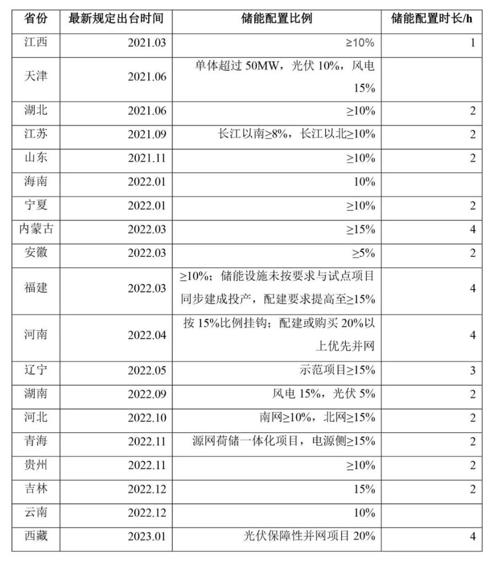 為響應(yīng)上述國家政策的號(hào)召,在地方層面,已有多地有關(guān)部門因地制宜地推出了新能源項(xiàng)目(主要為風(fēng)電、光伏電站)的強(qiáng)制配儲(chǔ)政策,部分列示如下: