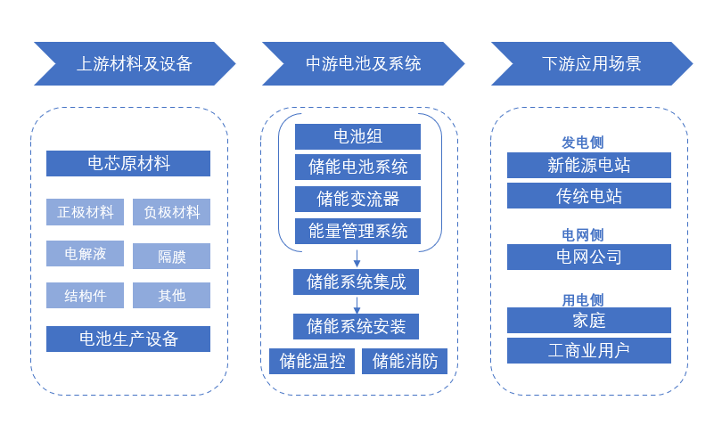 從整個(gè)產(chǎn)業(yè)鏈角度看,儲(chǔ)能產(chǎn)業(yè)鏈上游主要為材料及設(shè)備供應(yīng),中游主要為儲(chǔ)能系統(tǒng)的集成與制造,下游主要為電力系統(tǒng)儲(chǔ)能、備用電源及其他領(lǐng)域等。