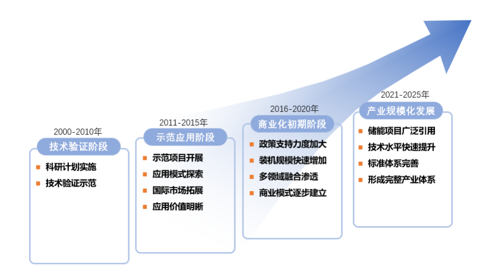 我國儲(chǔ)能市場(chǎng)大致可分為四個(gè)發(fā)展階段:一是技術(shù)驗(yàn)證階段(2010年以前),主要是開展基礎(chǔ)研發(fā)和技術(shù)驗(yàn)證示范;二是示范應(yīng)用階段(2011~2015年),通過示范項(xiàng)目開展,儲(chǔ)能技術(shù)性能快速提升、應(yīng)用模式不斷清晰,應(yīng)用價(jià)值被廣泛認(rèn)可,這個(gè)時(shí)期的儲(chǔ)能裝機(jī)以傳統(tǒng)的抽水蓄能為主;三是商業(yè)化初期(2016~2020年),隨著政策支持力度加大、市場(chǎng)機(jī)制逐漸理順、多領(lǐng)域融合滲透,儲(chǔ)能裝機(jī)規(guī)??焖僭黾印⑸虡I(yè)模式逐漸建立;四是產(chǎn)業(yè)規(guī)?;l(fā)展階段(2021~2025年),儲(chǔ)能產(chǎn)業(yè)進(jìn)入從產(chǎn)業(yè)化初期向規(guī)?;l(fā)展的過渡階段,隨著國家“雙碳”政策提出,儲(chǔ)能規(guī)模獲得了快速增長,儲(chǔ)能項(xiàng)目廣泛應(yīng)用、技術(shù)水平快速提升、標(biāo)準(zhǔn)體系日趨完善,形成較為完整的產(chǎn)業(yè)體系和一批有國際競爭力的市場(chǎng)主體,儲(chǔ)能成為能源領(lǐng)域經(jīng)濟(jì)新增長點(diǎn)。2022年2月,國家發(fā)展改革委、國家能源局印發(fā)的《“十四五”新型儲(chǔ)能發(fā)展實(shí)施方案》(以下簡稱“《實(shí)施方案》”)提出,到2025年,新型儲(chǔ)能由商業(yè)化初期步入規(guī)?;l(fā)展階段,具備大規(guī)模商業(yè)化應(yīng)用條件,有望2030年前后實(shí)現(xiàn)全面市場(chǎng)化。其中,新型儲(chǔ)能是指除抽水蓄能以外的新型儲(chǔ)能技術(shù),包括新型鋰離子電池、液流電池、飛輪、壓縮空氣、氫(氨)儲(chǔ)能、熱(冷)儲(chǔ)能等。