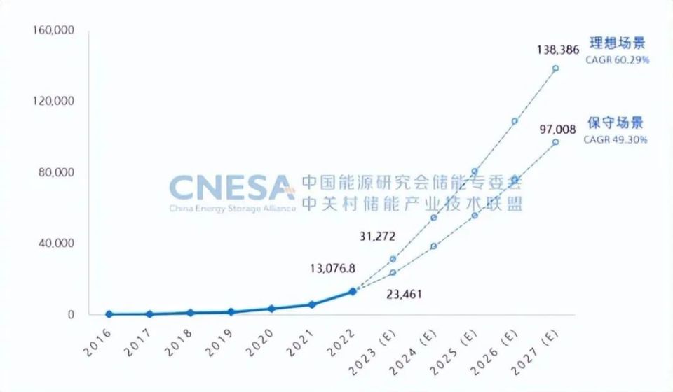 經(jīng)歷“十三五”孕育,“十四五”時(shí)期,我國新型儲(chǔ)能市場(chǎng)有望邁上新臺(tái)階。2021開始,我國新型儲(chǔ)能從商業(yè)化初期向規(guī)?;l(fā)展,根據(jù)CNESA預(yù)測(cè),在未來5年,“新能源+儲(chǔ)能”是新型儲(chǔ)能的主要應(yīng)用場(chǎng)景,政策推動(dòng)將構(gòu)成中國儲(chǔ)能市場(chǎng)的主要增長動(dòng)力;根據(jù)中國能源研究會(huì)儲(chǔ)能專委會(huì)/中關(guān)村儲(chǔ)能產(chǎn)業(yè)技術(shù)聯(lián)盟(CNESA)全球儲(chǔ)能數(shù)據(jù)庫的不完全統(tǒng)計(jì),截至2022年底,國內(nèi)已投運(yùn)的電力儲(chǔ)能項(xiàng)目累計(jì)裝機(jī)達(dá)59.8GW,占全球市場(chǎng)總規(guī)模的25%,年增長率38%,其中新型儲(chǔ)能持續(xù)高速發(fā)展,累計(jì)裝機(jī)規(guī)模首次突破10GW,累計(jì)裝機(jī)規(guī)模首次突破10GW,達(dá)到13.1GW/27.1GWh。未來5年,“新能源+儲(chǔ)能”是新型儲(chǔ)能的主要應(yīng)用場(chǎng)景,政策推動(dòng)是主要增長動(dòng)力;根據(jù)中關(guān)村儲(chǔ)能產(chǎn)業(yè)技術(shù)聯(lián)盟(CNESA)對(duì)我國新型儲(chǔ)能未來5年市場(chǎng)規(guī)模的預(yù)測(cè),保守場(chǎng)景下,預(yù)計(jì)2027年新型儲(chǔ)能累計(jì)規(guī)模將達(dá)到97.0GW,2023-2027年復(fù)合年均增長率(CAGR)為49.3%;理想場(chǎng)景下,預(yù)計(jì)2027年新型儲(chǔ)能累計(jì)規(guī)模將達(dá)到138.4GW,2023-2027年復(fù)合年均增長率(CAGR)為60.3%。預(yù)計(jì)未來5年,年度新增儲(chǔ)能裝機(jī)呈平穩(wěn)上升趨勢(shì)。保守場(chǎng)景下,年平均新增儲(chǔ)能裝機(jī)為16.8GW;理想場(chǎng)景下,年平均新增儲(chǔ)能裝機(jī)為25.1GW。