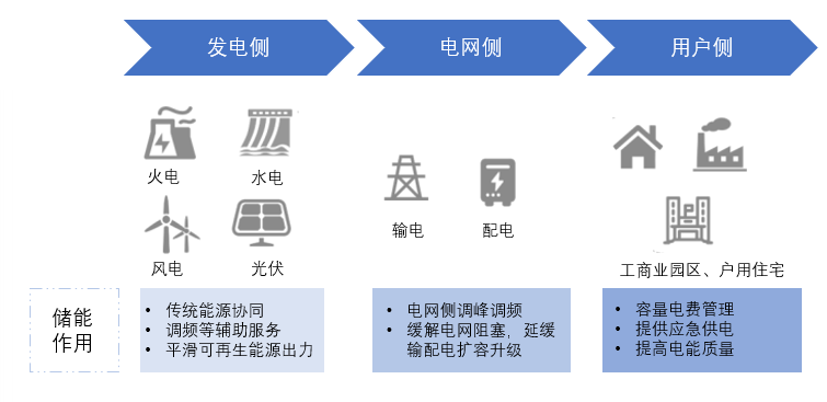 從整個(gè)電力系統(tǒng)的角度看,儲(chǔ)能的應(yīng)用場(chǎng)景可分為發(fā)電側(cè)儲(chǔ)能、電網(wǎng)側(cè)儲(chǔ)能和用戶側(cè)儲(chǔ)能三大場(chǎng)景。其中,發(fā)電側(cè)對(duì)儲(chǔ)能的需求場(chǎng)景類型較多,包括可再生能源并網(wǎng)、電力調(diào)峰、系統(tǒng)調(diào)頻等;電網(wǎng)側(cè)儲(chǔ)能主要發(fā)揮支撐電力保供、提升系統(tǒng)調(diào)節(jié)能力、支撐新能源高比例外送以及替代輸配電工程投資等作用;用戶側(cè)儲(chǔ)能主要用于電力自發(fā)自用、峰谷價(jià)差套利、容量電費(fèi)管理和提高供電可靠性等。然而,在實(shí)際應(yīng)用中,儲(chǔ)能的某一功能應(yīng)用并不局限于單一應(yīng)用場(chǎng)景,以平滑輸出、跟蹤出力計(jì)劃為例,可同時(shí)應(yīng)用于發(fā)電側(cè)、電網(wǎng)側(cè)和用戶側(cè)。