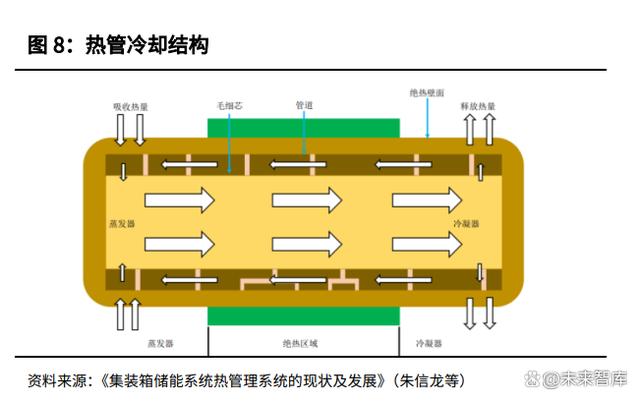相變材料和熱管冷卻仍處于在研階段,成本和穩(wěn)定性是影響其投產(chǎn)的重要原 因。相變材料冷卻是使電池單體直接接觸相變材料,利用其相變過程吸收熱 量實現(xiàn)對鋰離子電池的冷卻。相變材料冷卻可以明顯提升儲能系統(tǒng)溫度分布 的均勻性,但其價格較高,且當相變材料吸熱時,其體積變化明顯,容易對 儲能系統(tǒng)的工作性能產(chǎn)生影響。熱管是一種利用介質(zhì)在吸熱端的蒸發(fā)帶走熱 量,再在放熱端通過冷凝的方式將熱量傳遞到外界的裝置,這一冷卻技術已 相對成熟,但其成本較高,在手機等電子設備上使用較多,應用于儲能系統(tǒng) 上性價比低。