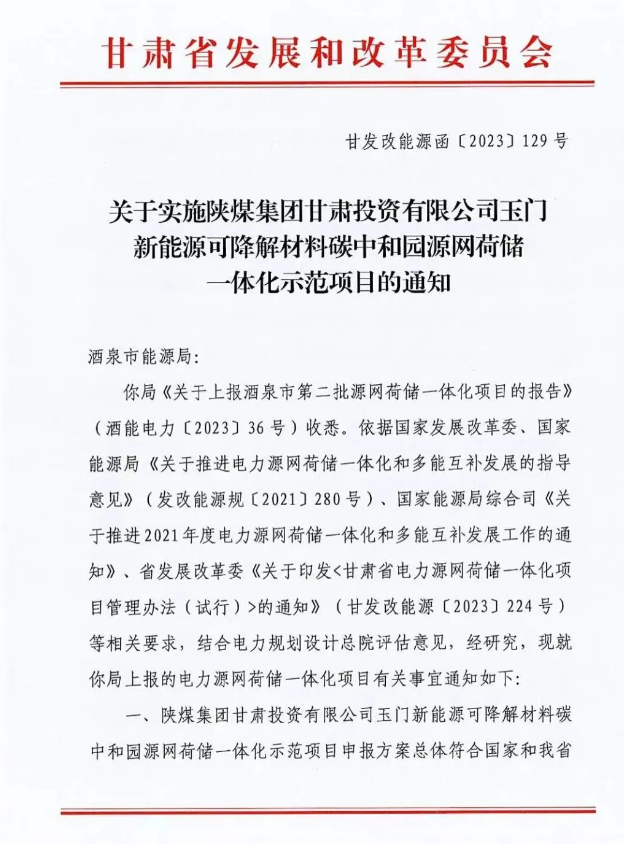 近日,從甘肅省發(fā)改委傳來喜訊,由陜煤集團甘肅投資有限公司(以下簡稱:甘肅投資公司)申報的“玉門新能源可降解材料碳中和產(chǎn)業(yè)園源網(wǎng)荷儲一體化項目”獲批,標志著全國最大、陜煤集團“十四五”發(fā)展規(guī)劃首批、甘肅投資公司首個源網(wǎng)荷儲一體化項目正式落地。