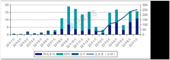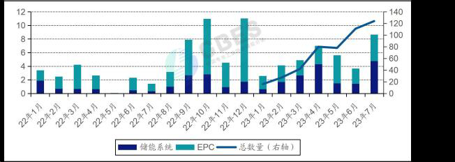 中國電池工業(yè)協(xié)會儲能分會近日發(fā)布的2023中國新型儲能7月研究簡報顯示,儲能市場持續(xù)火熱,7 月儲能系統(tǒng)招標規(guī)模創(chuàng)歷史新高。分會共統(tǒng)計到儲能招標項目252個,總規(guī)模達到15.8GWh ,環(huán)比增長1% ,同比增長425% 。其中,儲能EPC項目共計171個,規(guī)模為4.9GWh ,儲能系統(tǒng)項目共計81個,規(guī)模為10.9GWh。