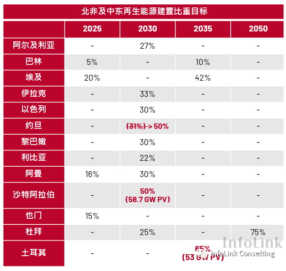 由于既有較成熟市場的商業(yè)模式與供應鏈成型,進入門坎拉高也更為競爭,因此新興市場如東南亞、中東、南美、非洲等成為企業(yè)欲搶占布局之區(qū),且受到光伏市場的刺激會帶動儲能維持熱度與需求,應用面今年則以表后工商業(yè)更受關(guān)注。然而,大部分此些市場的政策、程序、供應鏈、再生能源規(guī)模、電網(wǎng)、建設環(huán)境等都遠不如較成熟市場,相對也就需要更長的爬坡期且影響發(fā)展速率變量更多,導致該市場可能大幅起落。例如,新興市場目前出臺的政策多是以整體再生能源建置為目標,對于儲能的需求或發(fā)展尚無明確指引,以下表整理的北非與中東為例;其次,中國六月份的儲能裝機規(guī)模中工商業(yè)占比僅1%,說明市場需求與情緒雖旺盛,但實際規(guī)模需更審慎評估。