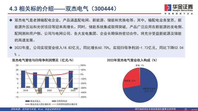 雙杰電氣是老牌輸配電企業(yè),產(chǎn)品涵蓋配電網(wǎng)、新能源、儲能和充換電等。其中,輸配電業(yè)務(wù)復(fù)蘇,新能源升壓站和光伏項(xiàng)目等迎來高增長。同時(shí),儲能系統(tǒng)集成取得突破,產(chǎn)品廣泛應(yīng)用在新能源的發(fā)電側(cè)、配網(wǎng)測和用戶側(cè)。公司與電網(wǎng)公司、各大發(fā)電集團(tuán)、企業(yè)長期保持密切合作,將充分受益新能源及儲能的高速發(fā)展。2022年度,公司實(shí)現(xiàn)營業(yè)收入18.82億元,同比增長60.70%,實(shí)現(xiàn)歸母凈利潤-1.72億元,同比下降52.04% 。