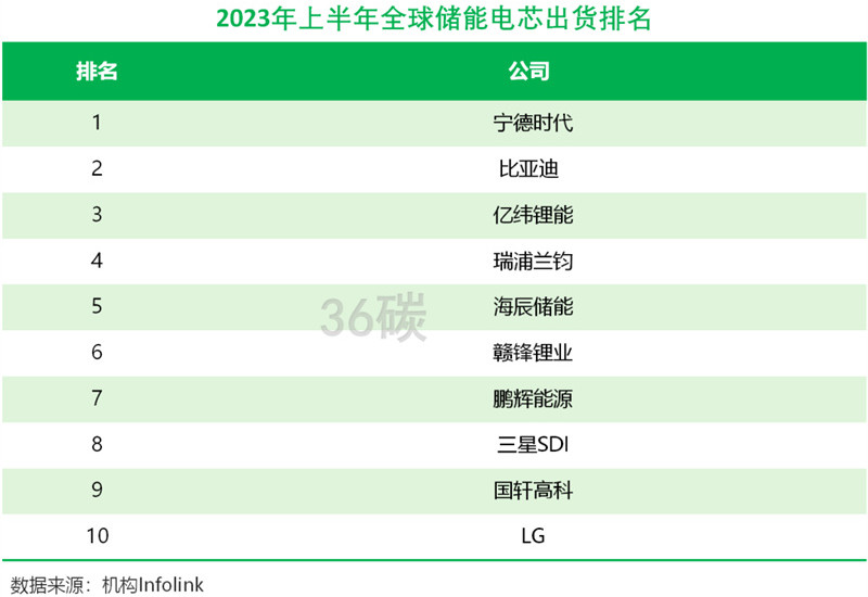 2023年上半年全球儲(chǔ)能電芯出貨量排名
