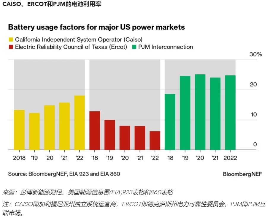 電池利用率受電池使用情況影響,也因地區(qū)而異。對于加利福尼亞州獨立系統(tǒng)運營商(CAISO),由于市場多元化的商業(yè)模式,利用率波動很大;而在德克薩斯州,對于電力可靠性委員會(ERCOT),電池主要提供調(diào)頻服務(wù),因此電池平均利用率較低;在PJM互聯(lián)市場中,電池也主要用于調(diào)頻,但由于市場對電池的循環(huán)需求高,利用率往往相當之高。