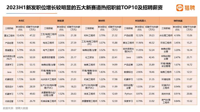 獵聘大數(shù)據(jù)研究院發(fā)布的《2023上半年就業(yè)趨勢大數(shù)據(jù)洞察》顯示,AIGC(人工智能生成內容)、新能源、新材料、對話機器人、綠色低碳五個賽道的新發(fā)職位今年上半年同比增長相對明顯,其中新能源位列第二位,數(shù)量同比增長42.49%。