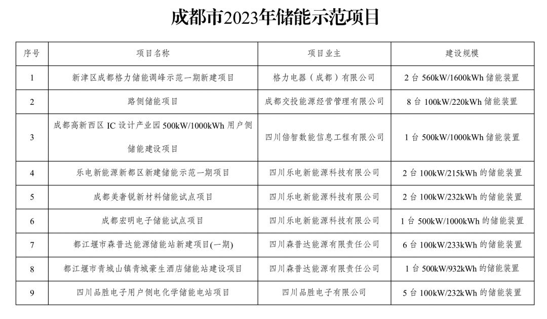 為加快推動成都市儲能產(chǎn)業(yè)發(fā)展,著力構建清潔低碳安全高效的現(xiàn)代能源體系,前期成都市發(fā)改委印發(fā)了《關于申報2023年污染治理和節(jié)能減碳領域(儲能專項)市預算內(nèi)投資項目的通知》(成發(fā)改環(huán)資函〔2023〕92號),對年利用小時數(shù)不低于600小時的儲能示范設施給予每千瓦230元/年補助,補貼周期為連續(xù)3年,每年最高不超過100萬。經(jīng)企業(yè)自愿申報和專家評審,共有9個儲能項目被納入成都市2023年儲能示范項目,現(xiàn)予以公示。