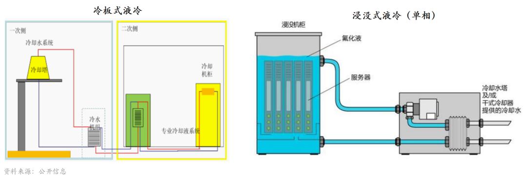 浸沒式液冷是指將發(fā)熱電子元器件如 CPU、主板、內存條、硬盤等直接浸泡在絕緣、化學惰性的冷卻液(電子氟化液)中,通過循環(huán)的冷卻液將電子元器件產生的熱量帶走。根據冷卻液在循環(huán)散熱過程中是否發(fā)生相變,分為單相浸沒式液冷和雙相浸沒式液冷。