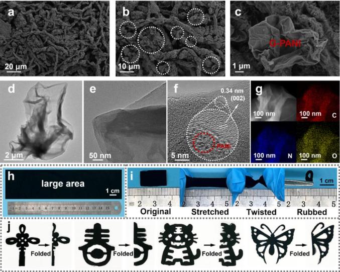 圖2(d-g)為G-PANI織物的透射電鏡照片,顯示出苯胺成功將GO還原為RGO。通過離心靜電紡絲可以實(shí)現(xiàn)超過90 cm2 G-PANI@pcPU織物的大規(guī)模制備(圖2h)。