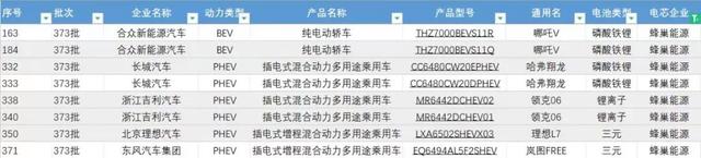 工信部373批公告中蜂巢能源配套的車型列表