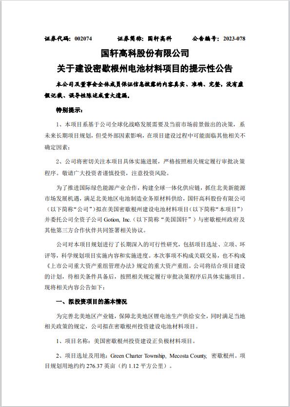 10月25日晚間,中國鋰電巨頭國軒高科發(fā)布公告,擬在美國密歇根州建設(shè)電池正負(fù)極材料項(xiàng)目,計(jì)劃總投資額達(dá)23.64億美元(約合人民幣173億元),并委托公司全資子公司美國國軒與密歇根州政府及其他第三方合作伙伴簽署相關(guān)協(xié)議。截至發(fā)稿,國軒高科暫報(bào)21.62元,跌1.32%,總市值383.9億元。