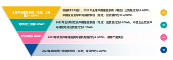 根據(jù)國內產(chǎn)業(yè)機構EESA統(tǒng)計,2022年全球戶用儲能系統(tǒng)(電池)出貨量約為24.4GWh,其中對歐洲戶用儲能市場出貨量達到約9.8GWh;然而,2022年歐洲戶用儲能實際裝機4.6GWh,僅2022年底歐洲戶用儲能系統(tǒng)(電池)庫存約為5.2GWh。