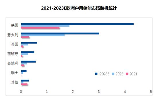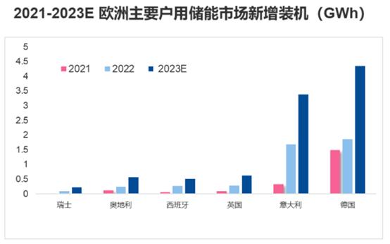 奧地利H1新增裝機將略低于英國,但超過西班牙達到0.3GWh;與此同時瑞士,荷比盧地區(qū)預計將增加0.32GWh; 整體歐洲戶用市場新增裝機規(guī)模在2023年將達到9.57GWh。