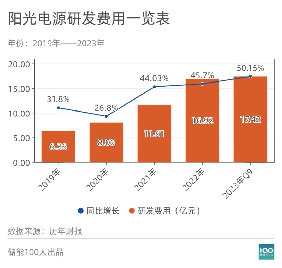 事實(shí)上,陽光電源自1997年成立起,26年來一直不斷加大科研投入,時(shí)刻不忘技術(shù)創(chuàng)新。截至目前,其在合肥、上海、南京、深圳、德國(guó)、荷蘭有六大研發(fā)中心,研發(fā)人員占比40%,2023年前三季度研發(fā)費(fèi)用投入17.42億元。申請(qǐng)專利5300余項(xiàng),持有數(shù)業(yè)內(nèi)第一。