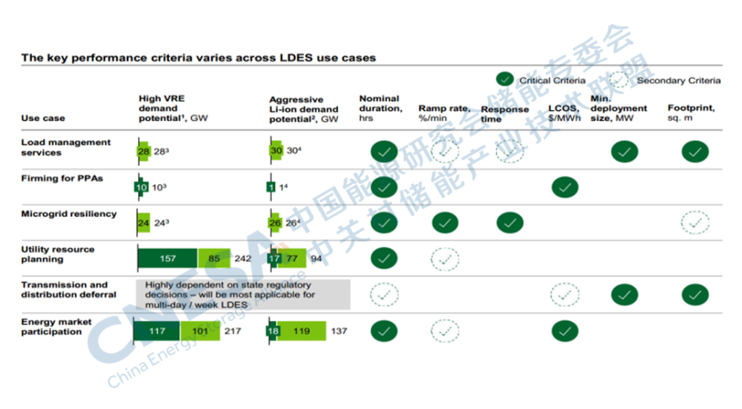 圖4針對這六個競爭因素分析了主要的LDES應用場景。關鍵性能標準因LDES應用場景而異。