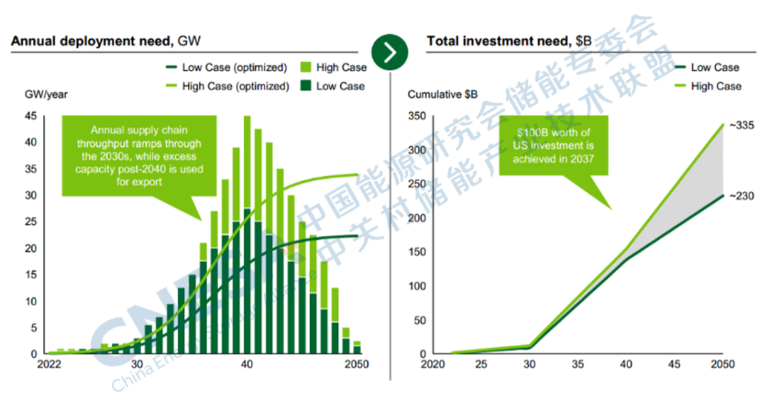 備注:圖中PUC代表公共事業(yè)委員會,RA代表資源充足。起飛點被定義為LDES行業(yè)成為一個很大程度上自我維持的市場;在鋰離子電池競爭的情況下,仍然需要多日/周的LDES技術,而積極的鋰離子電池將減少供應鏈建設的需求。