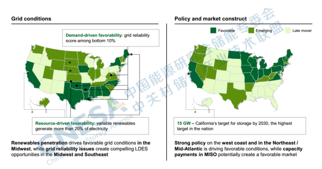 在美國由于不同的電網(wǎng)條件、政策和市場結構,LDES部署的就緒程度各不相同。報告指出:有兩個因素可以用來評估市場LDES的就緒程度:電網(wǎng)條件、政策和市場結構。一是電網(wǎng)條件。衡量LDES在特定狀態(tài)下的可獲得性和相對可行性,以及整體發(fā)電組合。影響因素包括間歇性可再生能源的滲透率百分比、輸配電投資缺口、SAIDI/SAIFI得分衡量的電網(wǎng)彈性以及互聯(lián)的難易程度。二是政策和市場結構。衡量地方政策和收入結構對在該州部署具有有利風險調整回報預期的LDES的有利程度。影響因素包括可再生能源投資組合標準(RPSs)、是否有容量支付以及支付的水平等。通過評估,可以得出加利福尼亞、德克薩斯、紐約、緬因州、愛荷華州和康涅狄格州在近期內具有很高的潛力(圖8)。