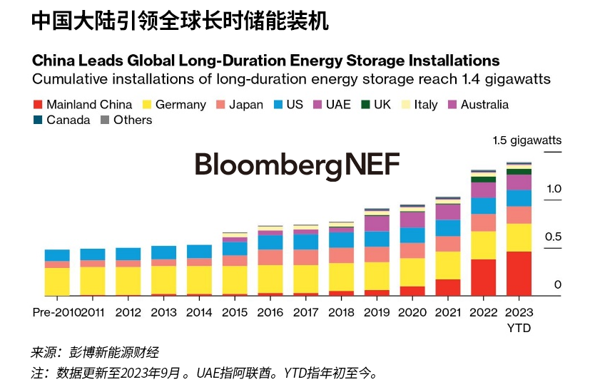 根據(jù)彭博新能源財(cái)經(jīng)的數(shù)據(jù),截止到今年9月,全球已經(jīng)投產(chǎn)的長時(shí)儲能達(dá)1.4GW/8.2GWh,而儲備項(xiàng)目已經(jīng)達(dá)到33GW/156GWh,其中,中國是最大的市場,占儲備項(xiàng)目裝機(jī)容量的92%。