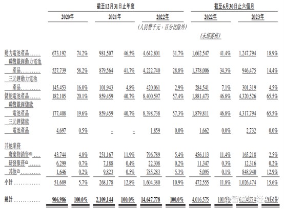 其中,儲(chǔ)能電池產(chǎn)品占營(yíng)業(yè)收入的比重連續(xù)增長(zhǎng),2020年至2022年分別為20.1%、40.7%、57.4%;動(dòng)力電池產(chǎn)品的占比則在報(bào)告期內(nèi)有所下降,分別為74.2%、46.5%、31.7%。截至2023年前6個(gè)月,動(dòng)力電池產(chǎn)品收入達(dá)到12.48億元,占比約為18.9%,儲(chǔ)能電池產(chǎn)品收入約為43.21億元,占比則為65.5%。