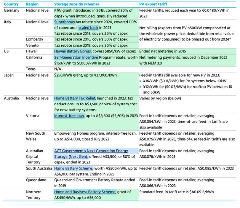 注:綠色=支持戶用儲能普及的主要驅動因素。*=意大利對新光伏系統(tǒng)的凈計費政策將于2024年1月1日終止,而現(xiàn)有系統(tǒng)需要在2024年年底前逐步轉為補償較低的計劃,補償金額約為100歐元/MWh,具體取決于生產(chǎn)時間和地區(qū)。日本的光伏輸出電價適用于10-50kW的光伏系統(tǒng)。