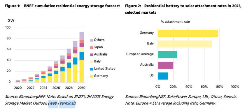 圖1:BNEF累計戶用儲能預期 圖2:2023年太陽能電池安裝率,選定市場