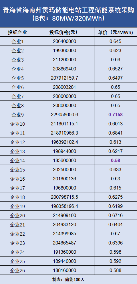 B包:容量為80MW/320MWh,共吸引了26家企業(yè)投標(biāo),最低報(bào)價(jià)為0.58元/Wh,最高報(bào)價(jià)為0.7158元/Wh。(投標(biāo)報(bào)價(jià)詳情見下圖)