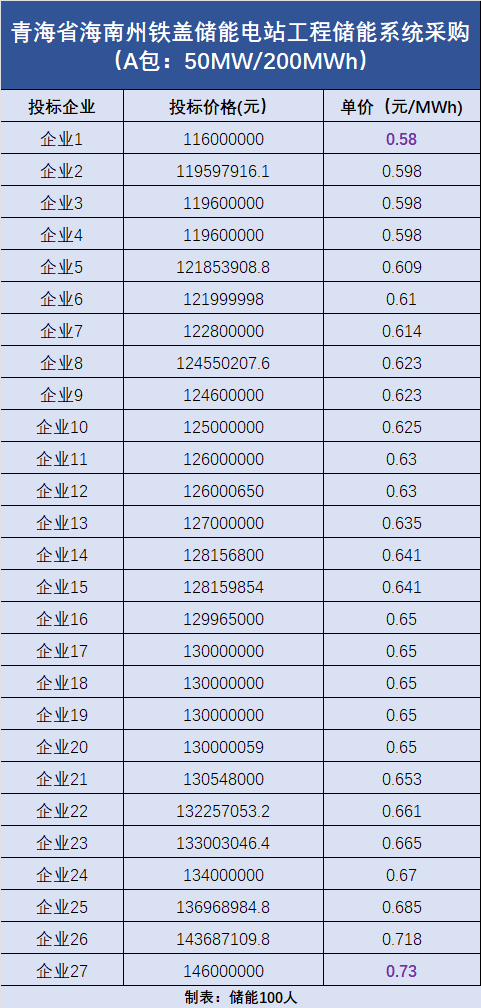 A包:容量為50MW/200MWh,共吸引了27家企業(yè)投標(biāo),最低報(bào)價(jià)為0.58元/Wh,最高報(bào)價(jià)為0.73元/Wh。(投標(biāo)報(bào)價(jià)詳情見下圖)