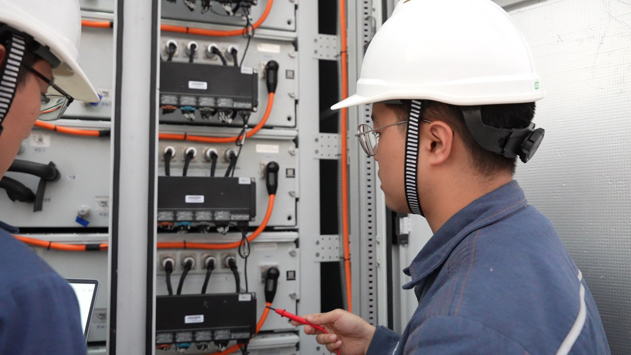 而在結(jié)構(gòu)連接方面,寶塘儲能站的連接方式多達(dá)5種,組串式、雙極式、單極式、低壓級聯(lián)、高壓級聯(lián)。其中,“高壓級聯(lián)”是南方電網(wǎng)首批“揭榜掛帥制”科研項目的攻關(guān)技術(shù),實(shí)體成果“我國首個高壓移動式儲能站”于2023年初在河北保定投運(yùn)。這種新技術(shù)通過模塊級聯(lián)的方式將儲能系統(tǒng)電壓直接升至10千伏,在大幅減少儲能系統(tǒng)數(shù)量的情況下實(shí)現(xiàn)同等效率,省去變壓器的儲能系統(tǒng)可靈活移動,解決了傳統(tǒng)儲能應(yīng)用場景受限的問題,迅速成為行業(yè)研發(fā)應(yīng)用的“熱門”。“安裝在寶塘儲能站的兩套高壓級聯(lián)儲能系統(tǒng),相對于河北保定系統(tǒng),硬件結(jié)構(gòu)及控制保護(hù)方面均實(shí)現(xiàn)了技術(shù)優(yōu)化,綜合性能更優(yōu)。”南網(wǎng)儲能高壓級聯(lián)攻關(guān)團(tuán)隊成員李勇琦指著新投運(yùn)的高壓級聯(lián)電池艙說道。