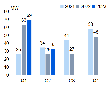 美國工商儲現(xiàn)狀:根據(jù)Wood Mackenzie數(shù)據(jù),2023H1,美國新增工商儲裝機累計達101.6MW/310.3MWh,同比+14.3%/+53.7%。據(jù)該機構預測,后續(xù)供應鏈的挑戰(zhàn)和各州相關政策的缺乏會對工商儲安裝造成沖擊。