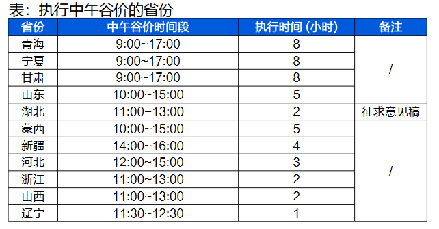 此外,當前峰谷價差套利是工商業(yè)儲能的主要盈利渠道,儲能系統(tǒng)價格下行有望進一步提升經濟性。隨著光伏發(fā)電供大于求,中午執(zhí)行谷段電價或成為趨勢。截至目前,全國已有11個省份部分月份中午出現(xiàn)谷電,2充2放從原來的1次峰/谷+1次峰/平轉變?yōu)?次峰/谷,儲能收益進一步提升。