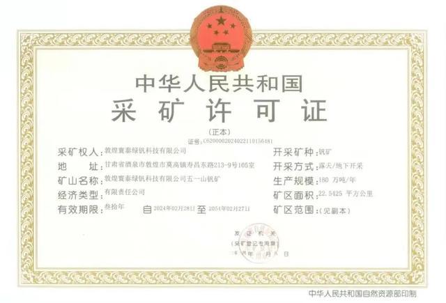 此次獲得開采權的礦山名稱為敦煌寰泰綠釩科技有限公司五一山釩礦,有效期限三十年,開采礦種為釩礦,礦床規(guī)模為中型,開采規(guī)模為180萬噸/年,礦區(qū)面積為22.5425平方公里。