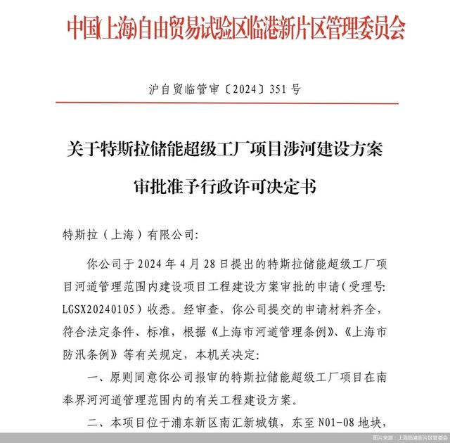 5月8日,上海臨港新片區(qū)管委會官網(wǎng)顯示,已公布關(guān)于與特斯拉儲能超級工廠項(xiàng)目涉河建設(shè)方案審批準(zhǔn)予行政許可決定書,同意特斯拉(上海)報(bào)審的特斯拉儲能超級工廠項(xiàng)目在南奉界河河道管理范圍內(nèi)的有關(guān)工程建設(shè)方案。