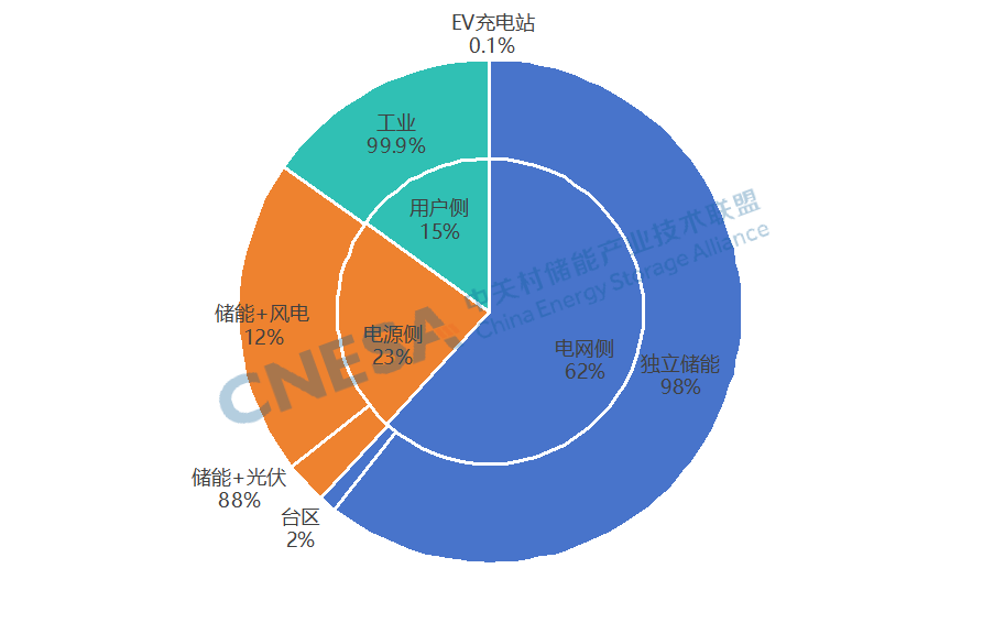 獨立儲能占比回升,獨立儲能、新能源配儲主導(dǎo)市場。從應(yīng)用分布上看,
