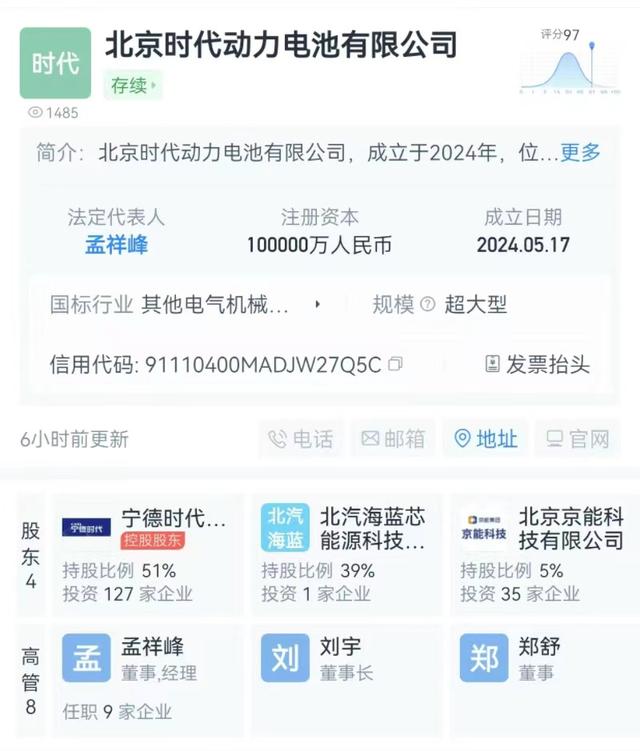 《中國經(jīng)營報(bào)》記者在天眼查上看到,5月17日,北京時(shí)代動(dòng)力電池有限公司成立,法定代表人為孟祥峰,注冊資本10億元人民幣,是一家以從事電氣機(jī)械和器材制造業(yè)為主的企業(yè)。股東信息顯示,該公司由寧德時(shí)代、小米汽車科技有限公司、北汽海藍(lán)芯能源科技(北京)有限公司、北京京能科技有限公司共同持股。