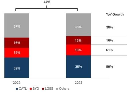 2023年全球電動汽車電池裝機容量同比增長44%,寧德時代和比亞迪作為中國電池制造商的代表,拿下了超過三分之二的市場份額,其中寧德時代是最大的受益者。