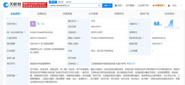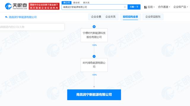 近日,南昌潤寧新能源有限公司成立,法定代表人為范一貞,注冊資本800萬人民幣,經(jīng)營范圍含工程和技術研究和試驗發(fā)展、新興能源技術研發(fā)、在線能源計量技術研發(fā)、合同能源管理、電池銷售等。股權全景穿透圖顯示,該公司由時代綠色能源有限公司全資持股,后者為寧德時代(300750)全資子公司。